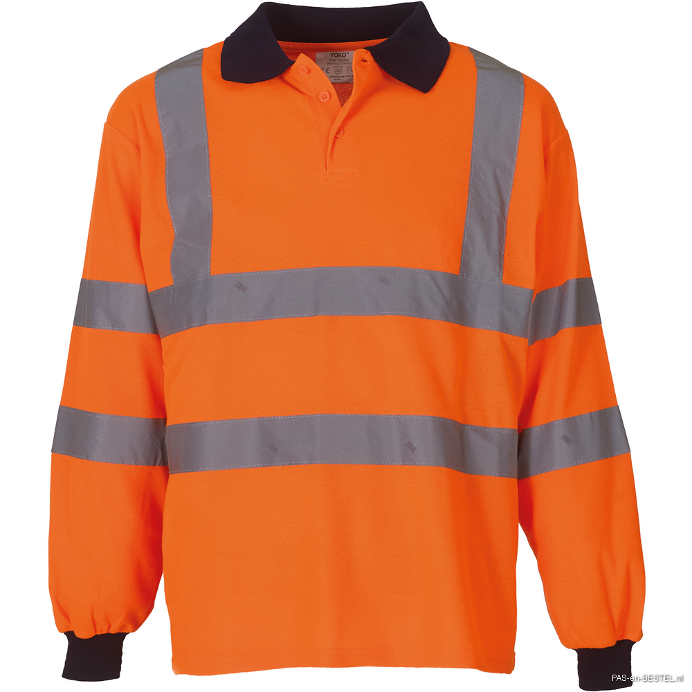 100% polyester. Twee reflecterende banden van 5cm breed over het lichaam, armen en schouders. Kraag en mouwuitenden in Navy contrast. Knooplijst met 3 knopen. Afwerking met dubbele stiksels. Hi-Vis Yellow en Hi Vis Orange EN ISO20471:2013 Class 3 conform. Hi Vis Orange ook conform UK GO/RT 3279 railway standard.