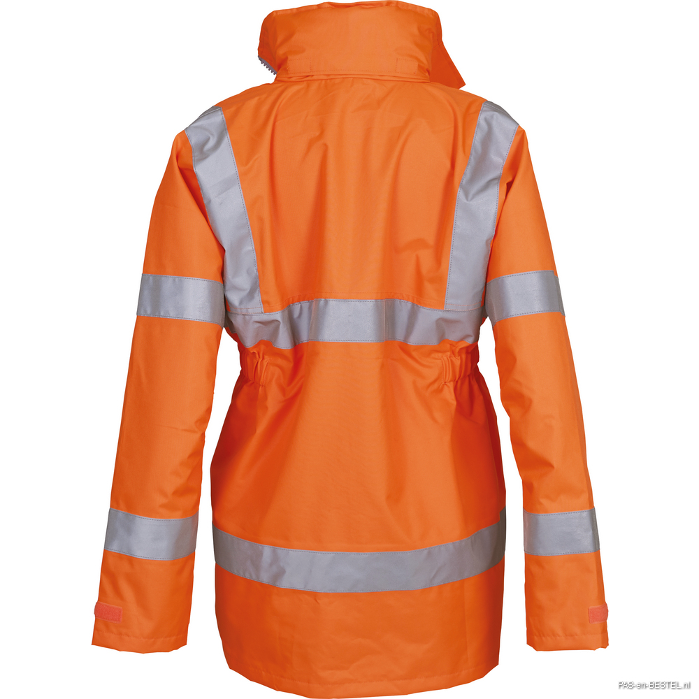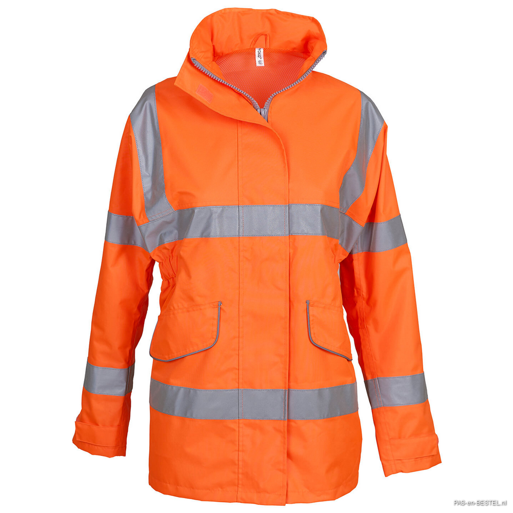 Jas in 100% polyester die wind en water buitenhoudt en ademt. Ton-sur-ton voering in mesh. Waterdichte, thermogelaste naden. In de kraag ingewerkte capuchon met klittenbandsluiting. Heel sterke ritssluiting met dubbele schuiver met een overslag met klittenbandsluiting. Zijzakken onder overslag met klittenbandsluiting met reflecterende bies. Klittenbandsluiting aan de mouwuiteinden, met gemoltonneerde binnenzijde. Borstzak binnenin rechts, voor een gsm. Getailleerde snit en semi-elastische tailleband voor een meer elegante look. Blinde drukkersrits onderaan het kledingstuk (binnenkant). Conform aan de normen EN ISO20471 van klasse 3 en EN 343:2003 + A1:2007 van klasse 3,3.